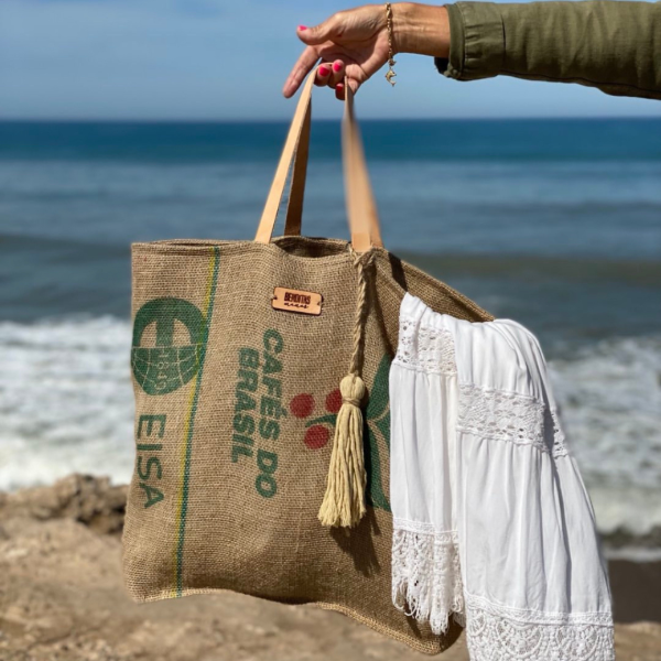 Bolsos de Sacos de Café, forrados, con bolsillos internos de cuero. Las bolsas respetan los colores pero no son exactos a nivel estampado.